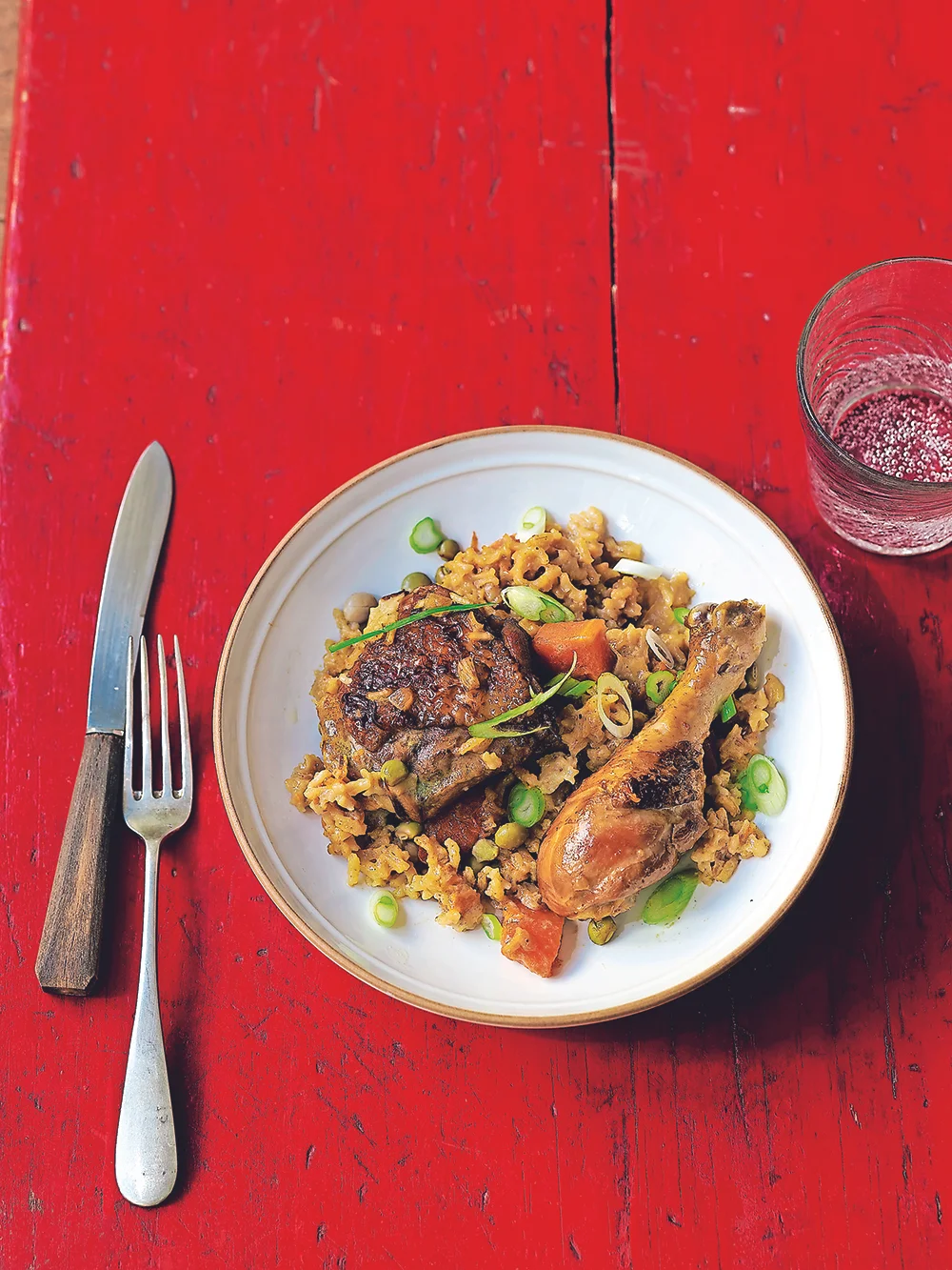 4. Heat the remaining 2 tablespoons oil in a pot on medium heat; when the oil is hot, sprinkle the brown sugar evenly over the base of the pot. Let the sugar melt and when it starts to bubble, add the chicken and sear it, turning often, until browned and coated with the “burnt” sugar, about 8 minutes. Add the peas and stir. Add 1 cup of the reserved cooking liquid and the coconut milk and cook for about 30 minutes.
